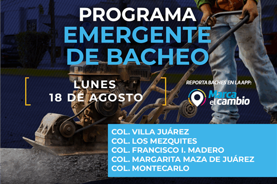 El Gobierno Municipal, a través de la Dirección de Obras Públicas, trabajará con bacheo mediante el programa emergente en calles de las colonias: Villa Juárez, Los Mezquites, Francisco I. Madero, Margarita Maza de Juárez y Montecarlo.