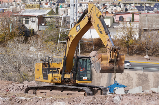 Las excavaciones de material tipo roca que se llevan a cabo actualmente con maquinaria pesada corresponden al desarrollo del estribo número 1. Asimismo, como parte de las acciones para proteger el área de trabajo, se realiza la colocación de barreras de concreto.